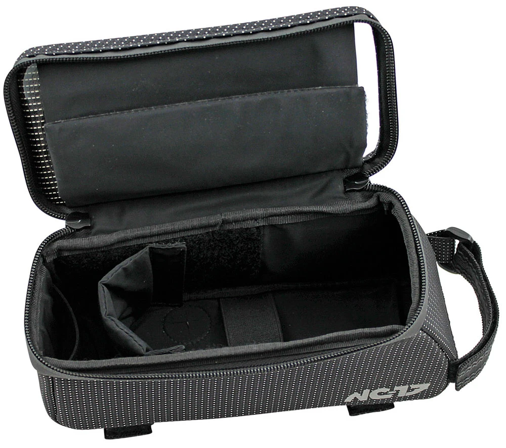L’assemblage simple et sûr est possible grâce aux attaches auto-agrippantes antidérapantes. Les batteries externes (Power Bank) peuvent être transportées en toute sécurité dans le sac. Le sac top tube DOT NC-17 dispose de deux chambres de rangement indépendantes séparées par des fermetures éclair, ce qui offre de grands avantages pour une utilisation en extérieur. Profitez de vos excursions et ne vous inquiétez pas pour votre smartphone – il est rangé en toute sécurité dans le sac NC-17 Connect. Une ouverture pour câble sur le fond vous permet de charger vos appareils électroniques en externe, par exemple à partir de la dynamo du moyeu (technologie de charge non incluse).