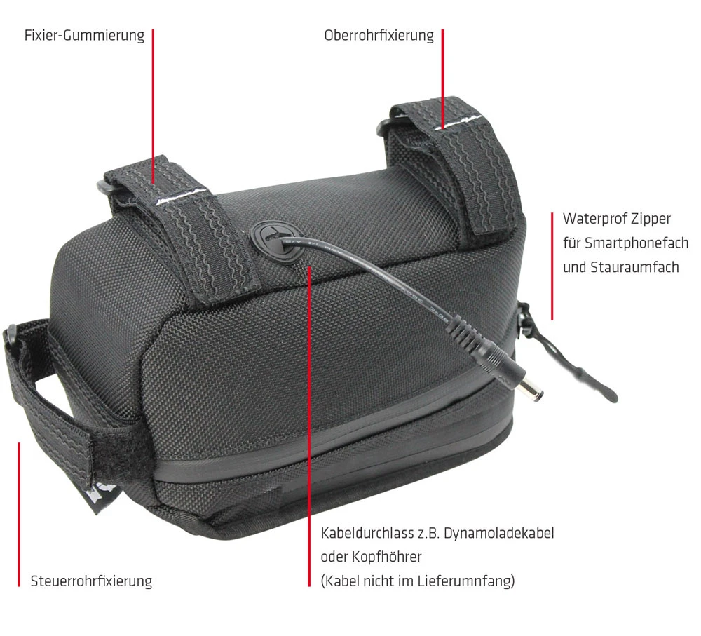 L’assemblage simple et sûr est possible grâce aux attaches auto-agrippantes antidérapantes. Les batteries externes (Power Bank) peuvent être transportées en toute sécurité dans le sac. Le sac top tube NC-17 dispose de deux chambres de rangement indépendantes séparées par des fermetures éclair, ce qui offre de grands avantages pour une utilisation en extérieur. Profitez de vos excursions et ne vous inquiétez pas pour votre smartphone – il est rangé en toute sécurité dans le sac NC-17 Connect.