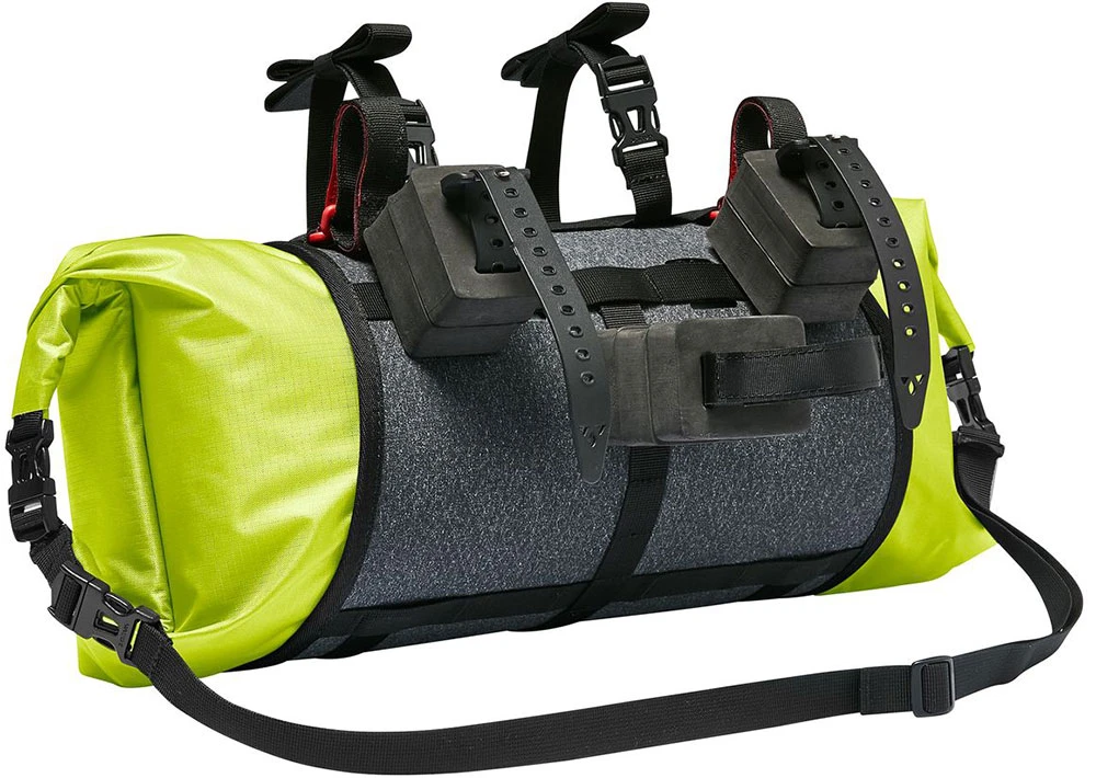 Les sangles de fixation du sac s’adaptent à tous les guidons de VTT ; avec une largeur de 30 cm, il est également compatible avec la plupart des guidons de gravel bike ou de vélo de route. Il suffit de l’attacher au guidon et à la tige de direction. La fixation est réglable en largeur et une entretoise pratique vous assure d’avoir toujours suffisamment d’espace pour freiner et changer de vitesse. Des sangles de compression velcro horizontales colorées et une double sangle verticale maintiennent le sac en place pour que votre chargement ne se déplace pas lorsque vous faites la course sur un sentier de gravier.